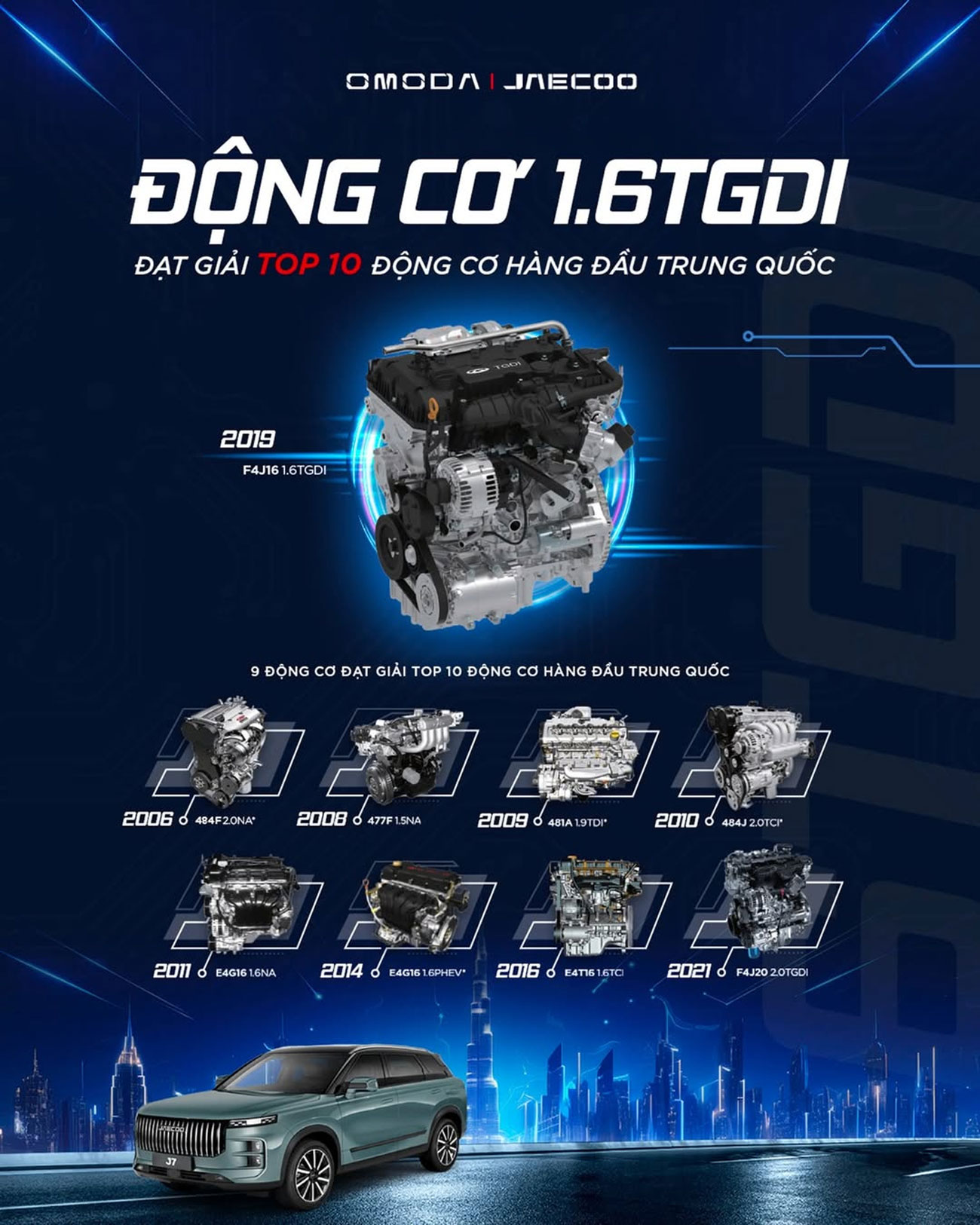 Động cơ 1.6TGDI được trang bị trên OMODA & JAECOO đã xuất sắc đoạt giải thưởng uy tín “Top 10 động cơ hàng đầu tại Trung Quốc”, đồng thời được đề cử “Giải thưởng Top 10 động cơ tốt nhất” tại Mỹ (Wards AutoWorld, 2021).