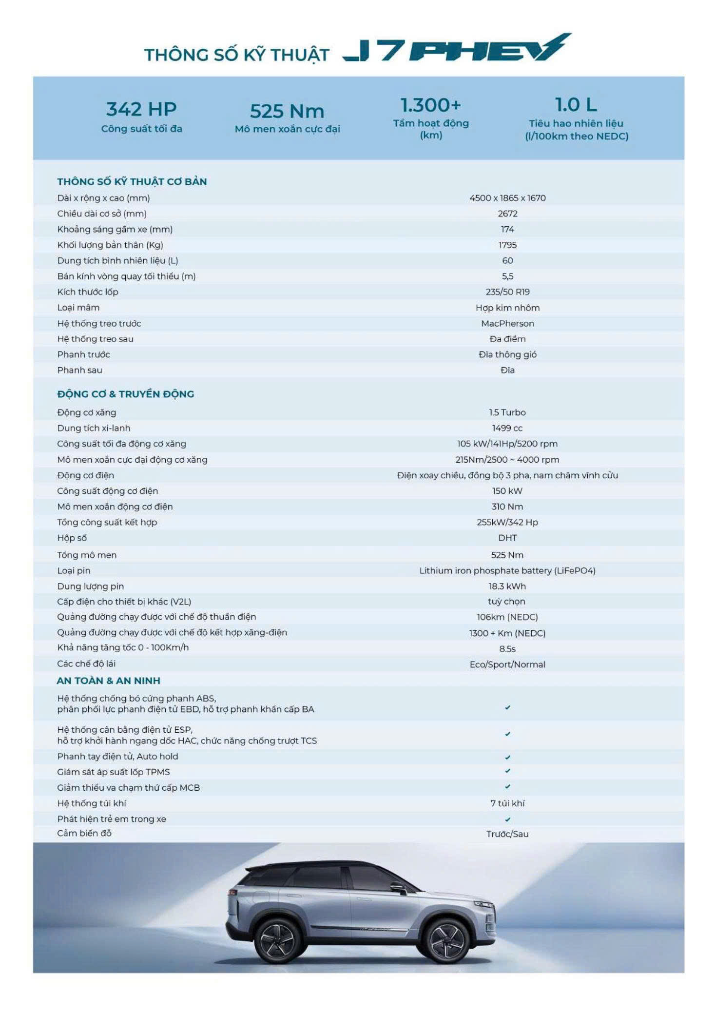 THÔNG SỐ KỸ THUẬT JAECOO J7 SHS